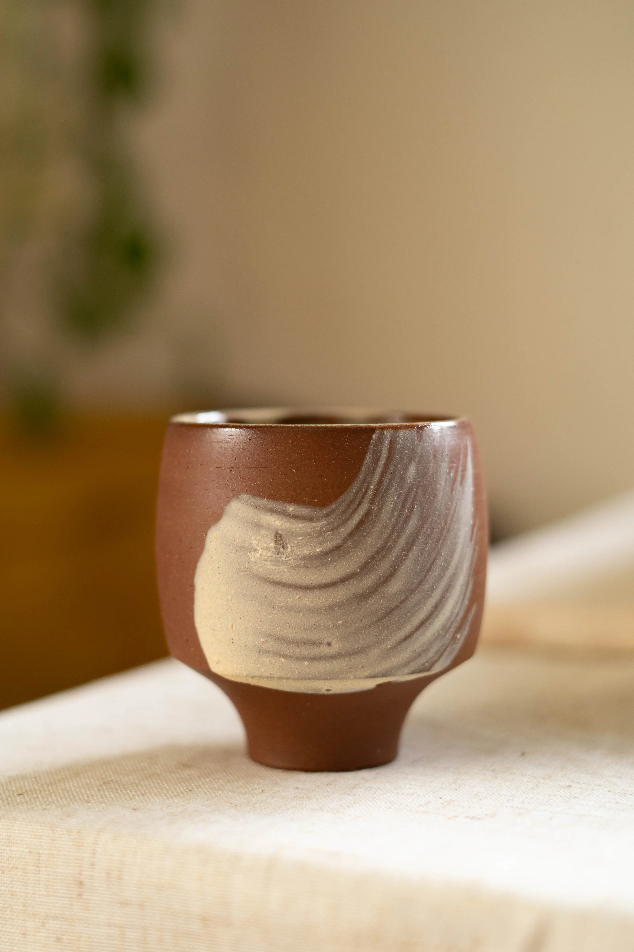 Handcrafted ceramic cup with a raw exterior and hand painted strokes of slip on two sides. Made from earthen red stoneware clay body, and painted with a creamy white slip, these cups have a raw exterior and a variegated creamy glaze on the interior.